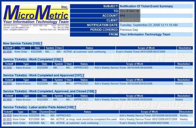 Thus was born MICRO_NOTES (MICRO-Micrometric Integrated Customer Report Organization) (NOTES-Notification Of Ticket Events with Selectivity), an optional tool you can use to be better informed about the status of work that MicroMetric is currently doing for you, our client, as Your Information Technology Team.