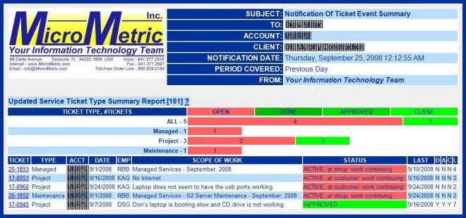 We want to let you know what the status of work in progress is, such as when a Trouble or Project Ticket is opened or closed. Such as when Server or Workstation maintenance has been scheduled and when it's complete.